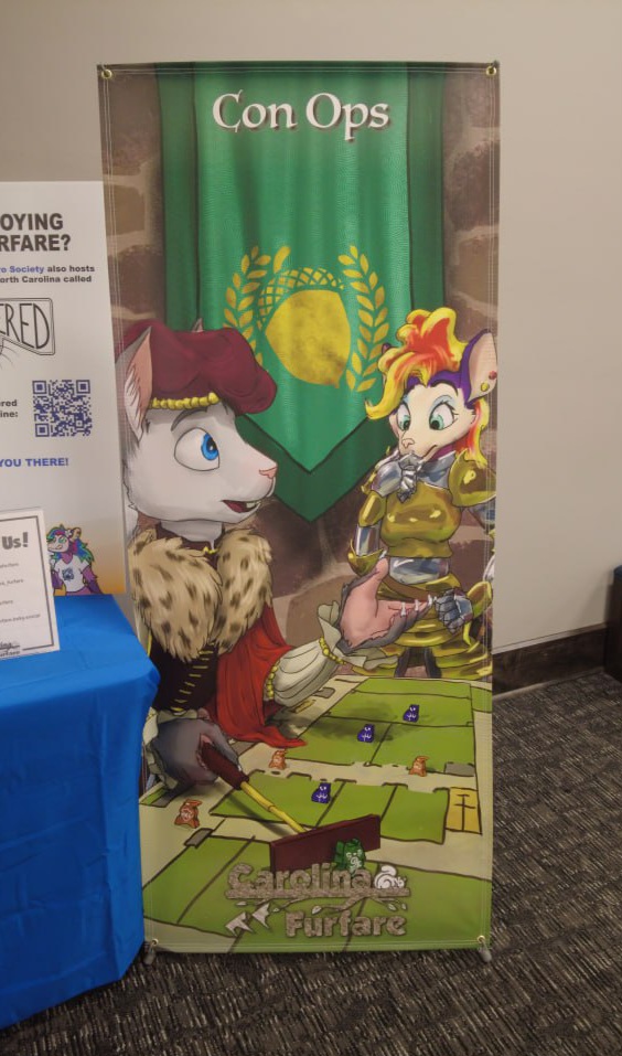 This was the banner I created for Con Ops. Since we didn’t have a Fursona-level supporter to put in this spot, I created it with the convention’s mascots, Petal and Aster. For the medieval theme, Aster dressed up as a prince, and Petal chose the knight captain of the royal guard.